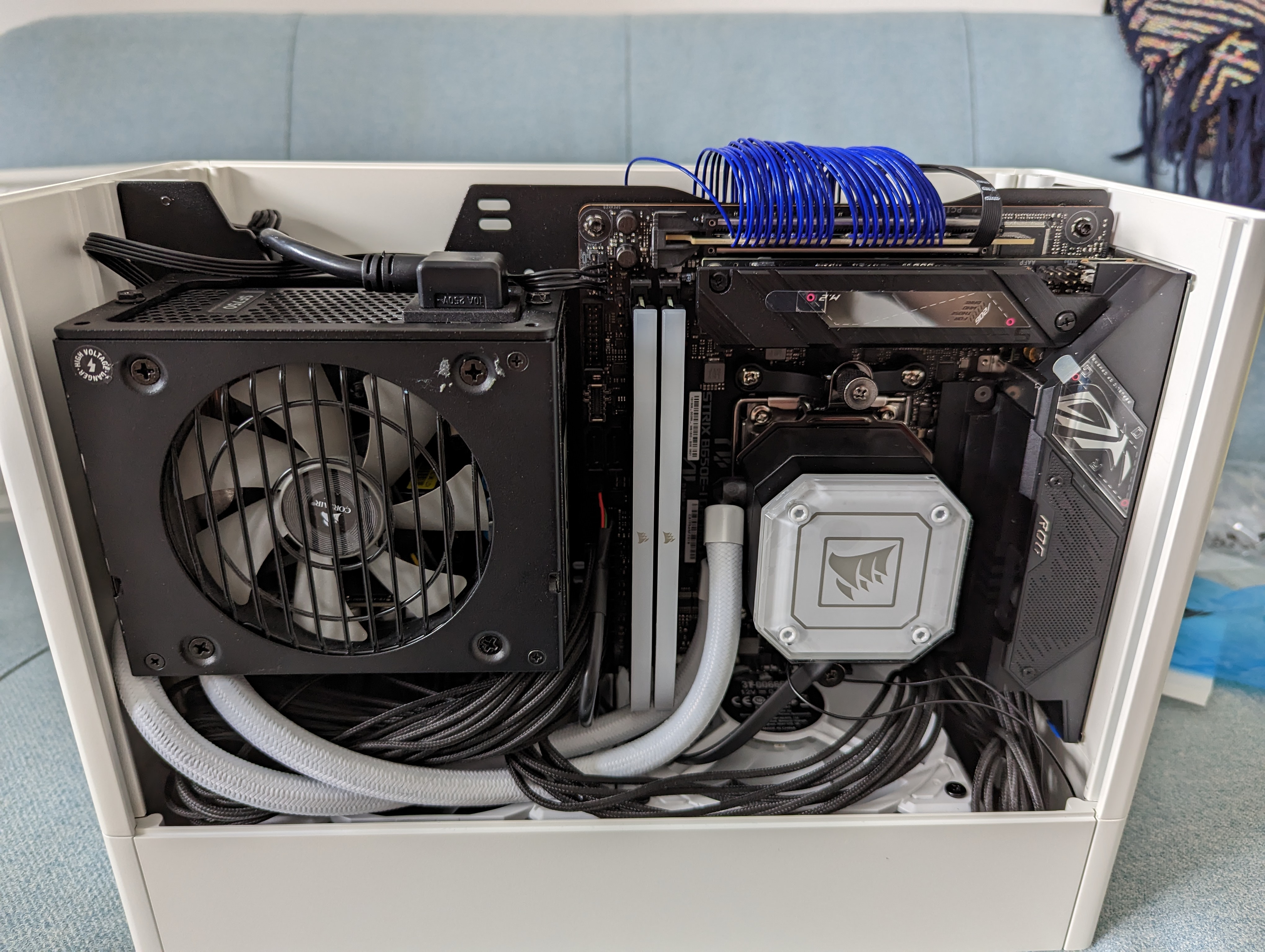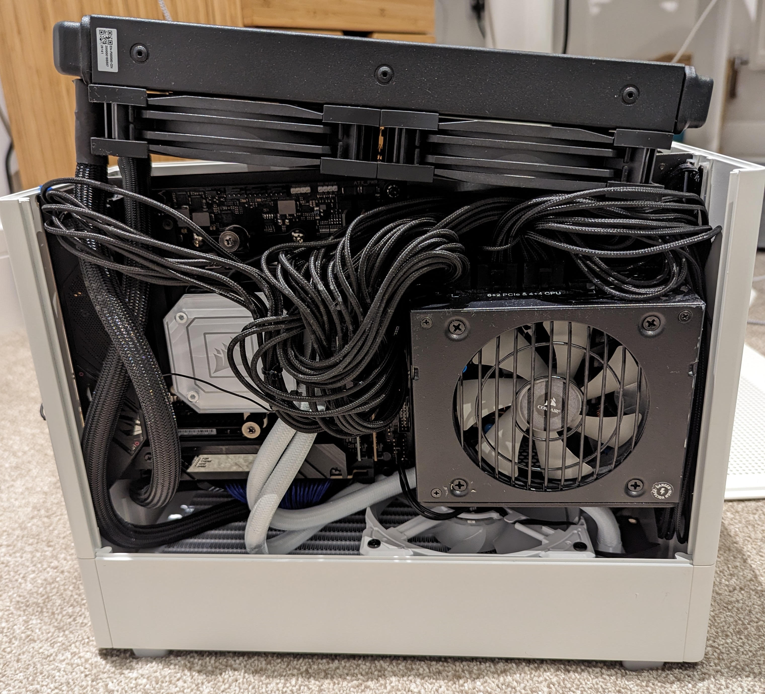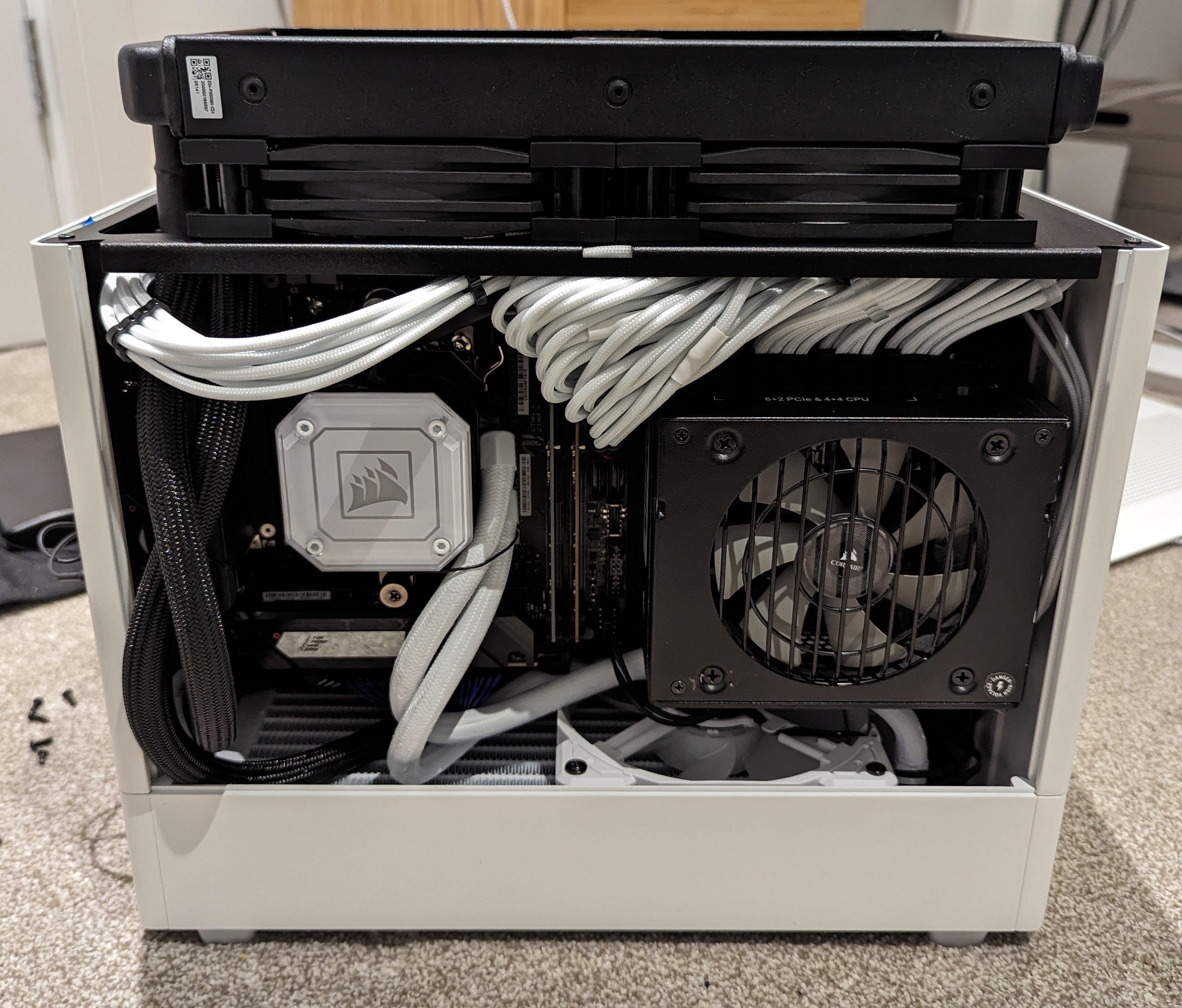 The cables were huge, and really not appropriate for such a small case. I needed something a bit more customised, and to fit in to the theme of the case I also wanted to get some white power cables. I turned to cablemod who seemed to have a good reputation, and provided a fully customised service. It was definitely expensive, but I put in the order and awaited their arrival which took about 2 weeks. Also note that the radiator for the CPU AIO only has one fan above, although I did manage to work around that later on.