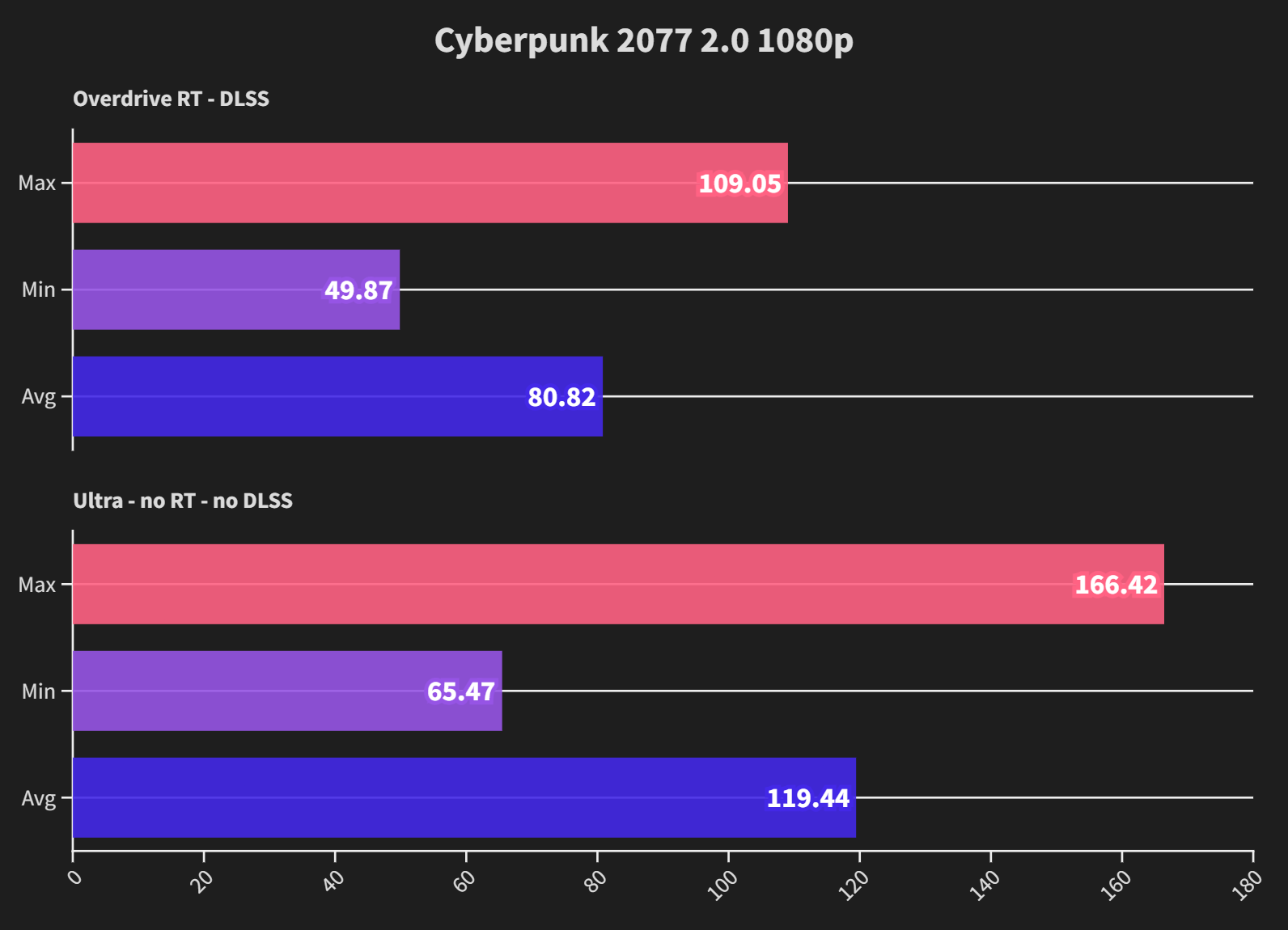Running some 1080p benchmarks for the sake of completeness, it would be a shame to use a 4090 at this resolution. Either the setup or Cyberpunk fails to scale well here, not much advantage in terms of framerate over 1440p, and seemingly there is no discernible difference outside the margins of error.