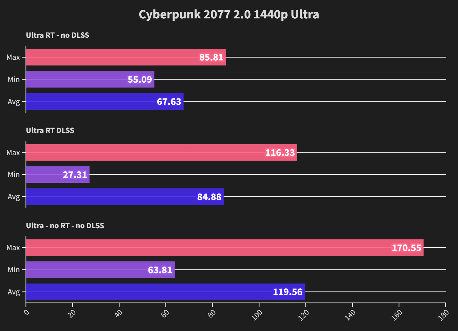 1440p Ultra allows the 4090 to really start pumping out the framerate, the pure rasterization performance of the 4090 can be seen with no RT and no DLSS on the last set of bars.