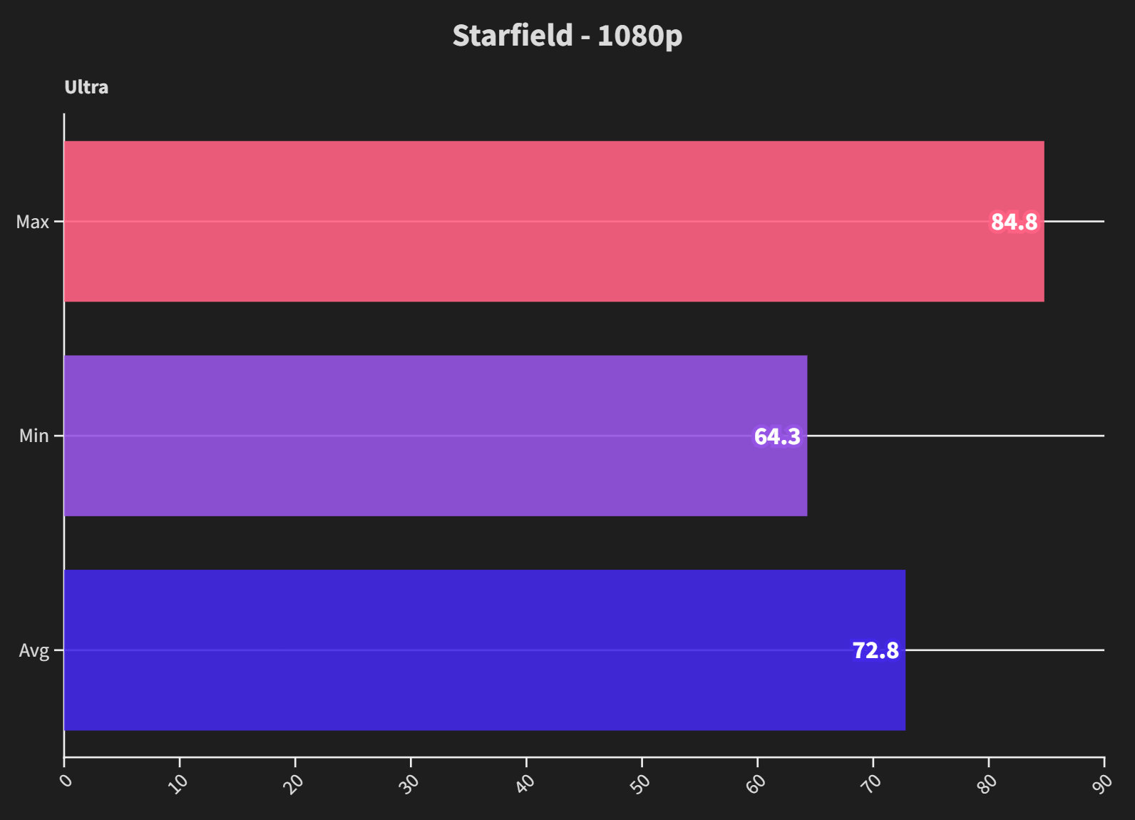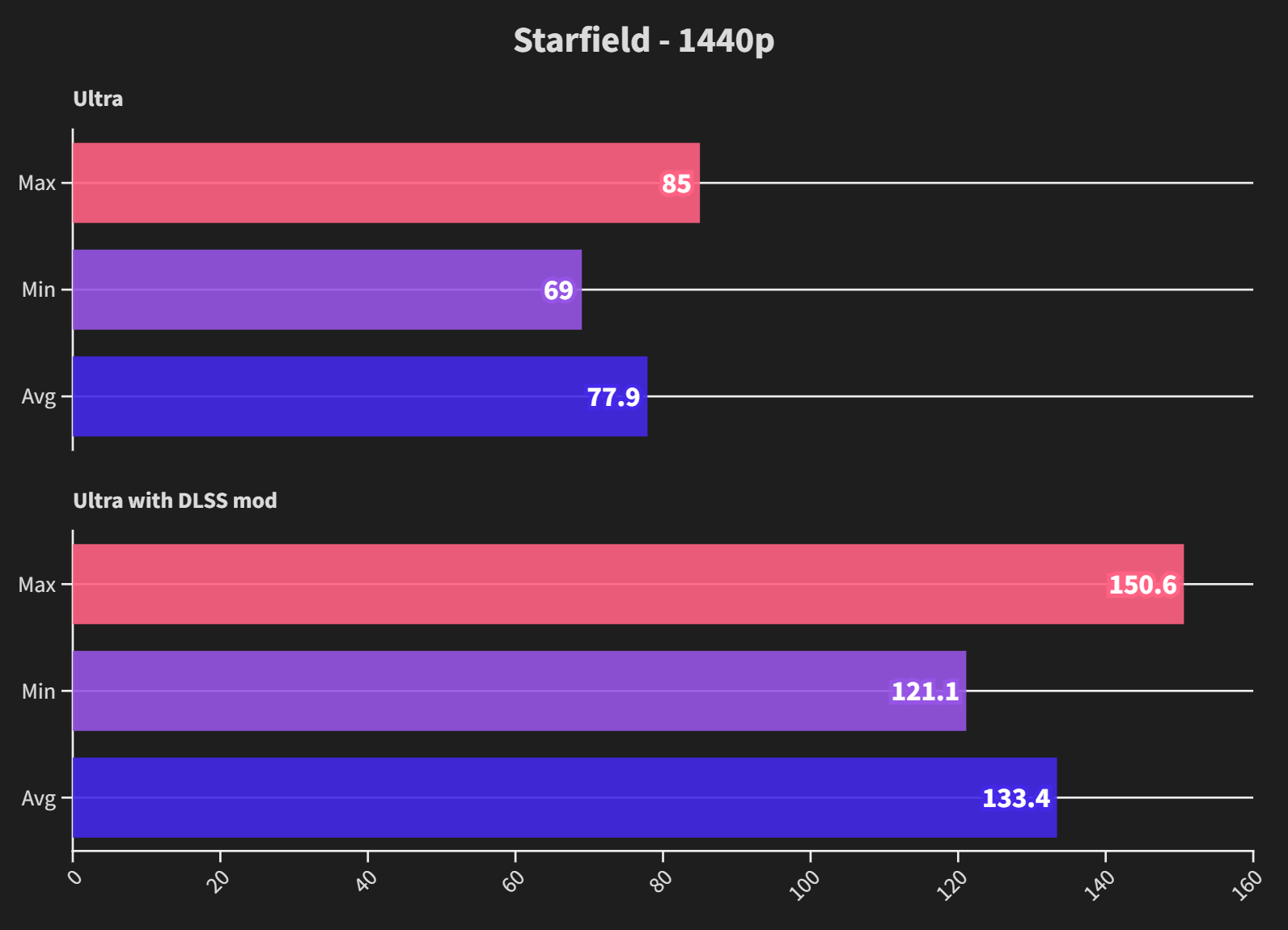 Again at 1080p the card or the Starfield itself is not scaling particularly well, meaning there is no increase in framerate over 1440p. Additionally, when using DLSS, it yielded no improvement, so I dropped it from the graph.